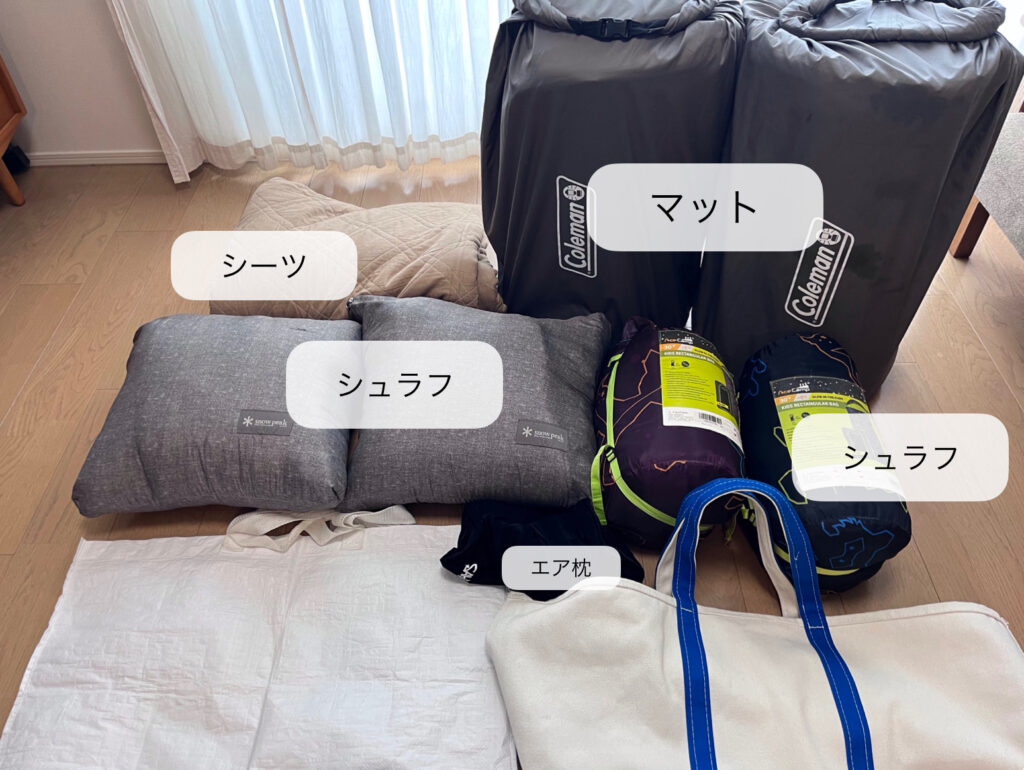 寝袋やシーツをまとめて運ぶために大きめの袋を使用しています。白いバッグは無印良品のお買い物バッグです。我が家ではとても重宝しています。
