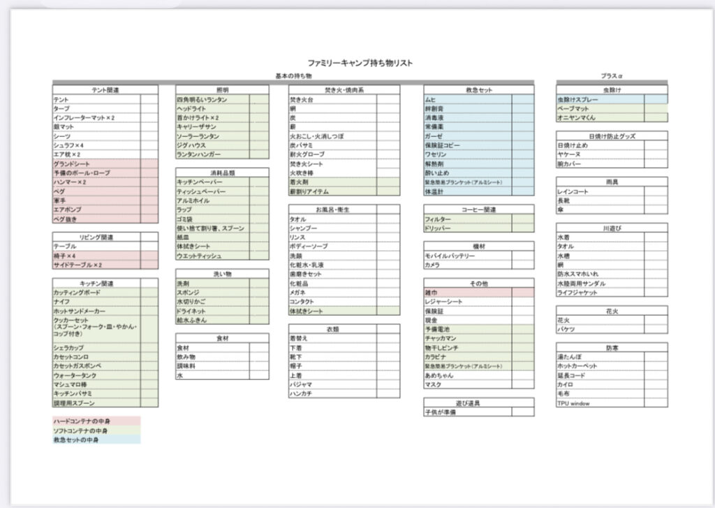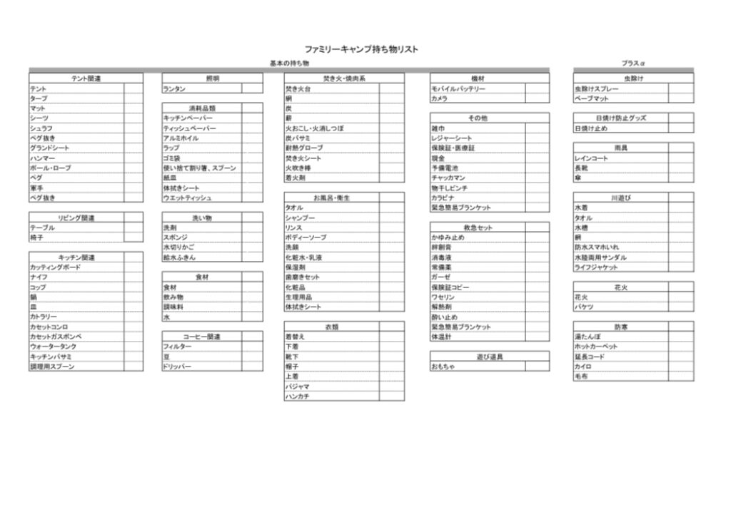 ファミリーキャンプの持ち物リストを作成しました。PDFとエクセルシートの2つがあるので、都合の良い方を使用してください。この持ち物リストは我が家のリストから、なくてもどうにかなるものを抜いて作成しました。ただし乳児期の子どもを連れて行くことは想定していないため、おむつやミルクなどは入っていません。必要な方は付け加えてください。