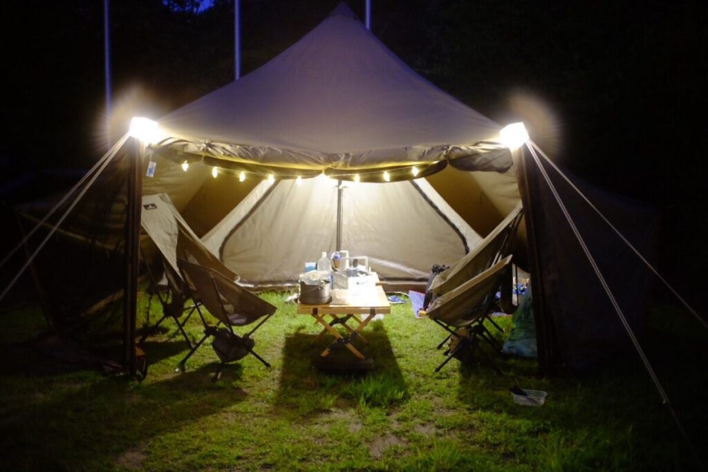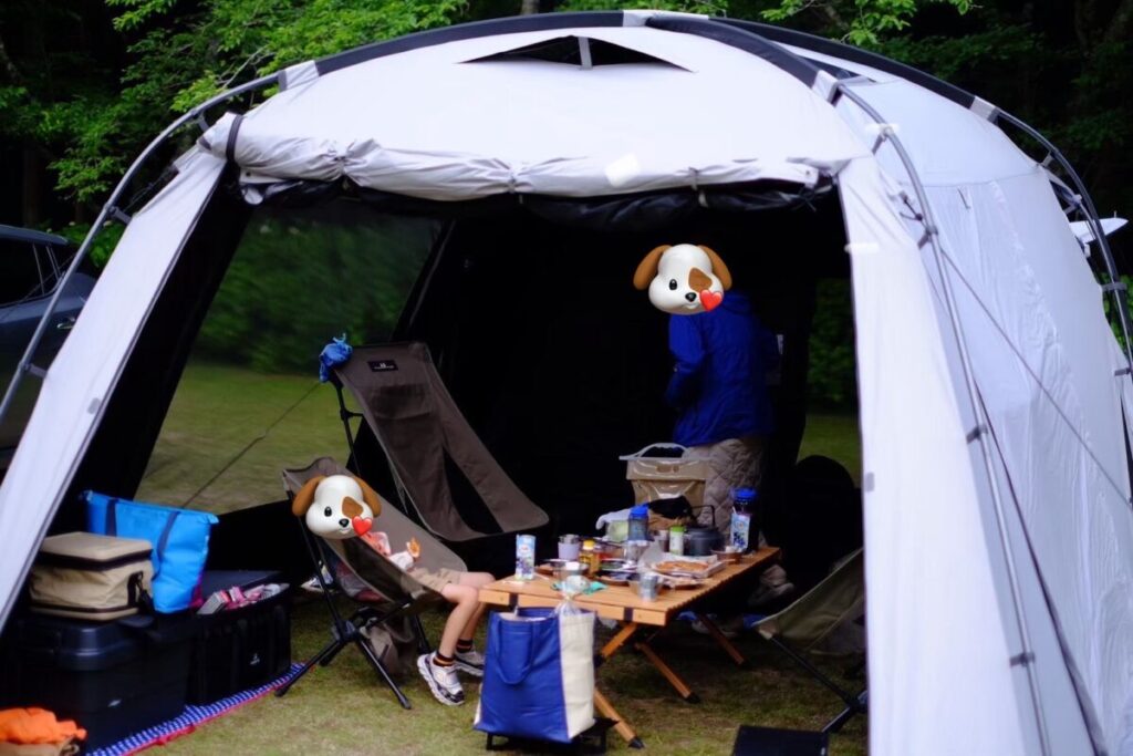 TOKYO CRAFTのセレニティ使用時の写真です。セレニティはColemanのタフスクリーンと同じ広さで、一般的な2ルームテントの大きさです。椅子の後ろの通路がほとんどありません。これ以上大きいテーブルでは使いづらいです。