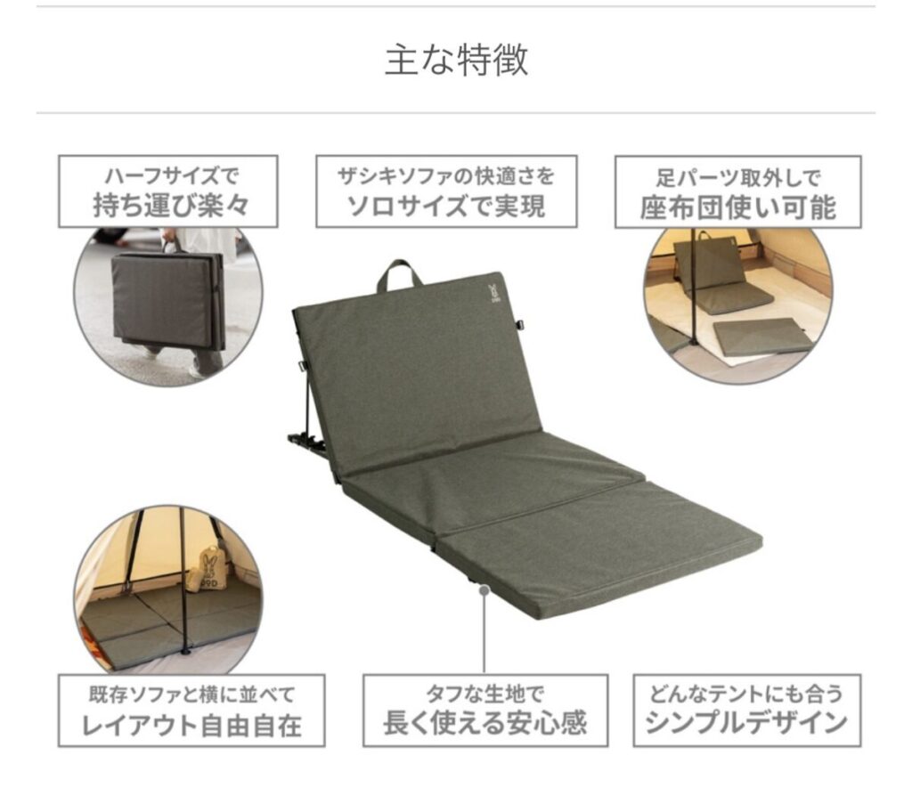 キャンプはもちろん、自宅でもソファとして使えるザシキソファ。1人用がでました!背もたれの角度は3段階に調節可能。
