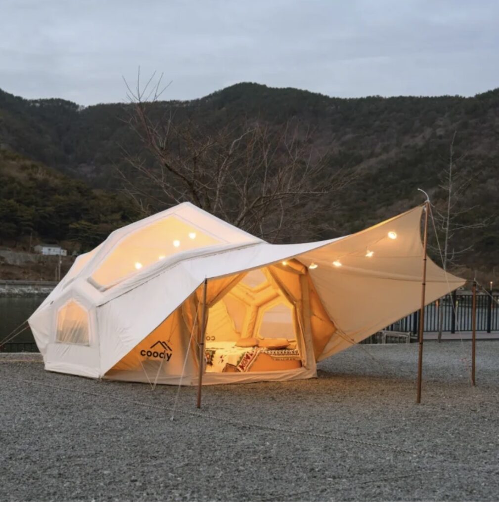 従来のポール式テントとは異なり、骨格部分に空気を送り込むだけでテントが立ち上がる画期的なシステムで、設営時間はわずか5〜15分。女性や初心者でも一人で簡単に設営できることから、ファミリーキャンプの新定番として急速に普及しています。