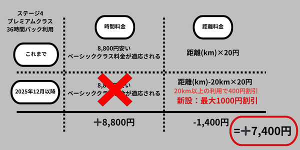 これまでのステージ3の特典には、ミドルクラスをベーシッククラスの料金、プレミアムクラスをミドルクラスの料金で利用可能という特典がありましたが、それが2025年12月からは廃止となり、距離料金から最大300円割引という優遇が新設されます。