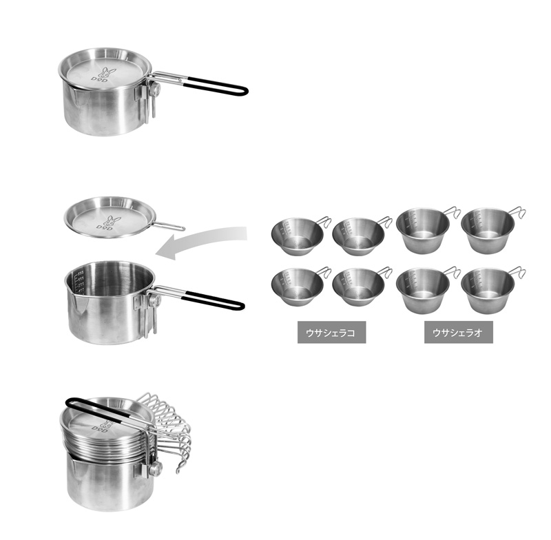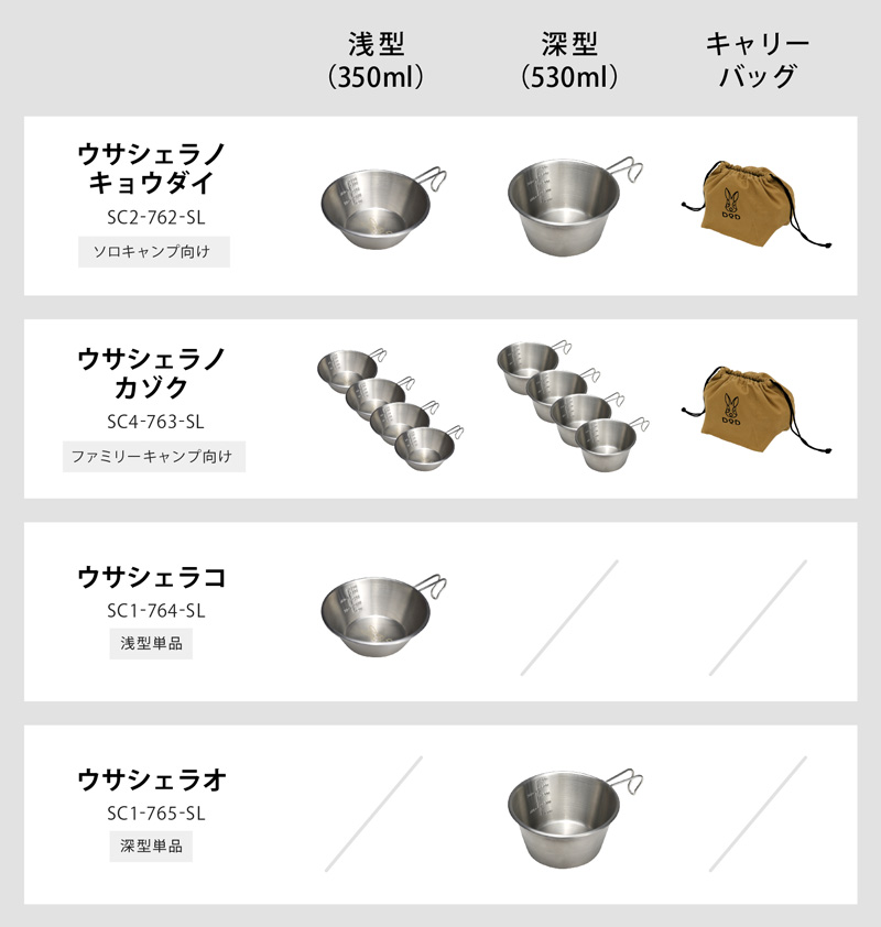 DODからは「ウサシェラノカゾク」以外にも、シェラケトルなどの関連商品がラインナップされています。シェラケトルには本製品8個すべてを入れて持ち運ぶことも可能です。また、それぞれのラインナップの名前がとても可愛く想像力を掻き立てます。